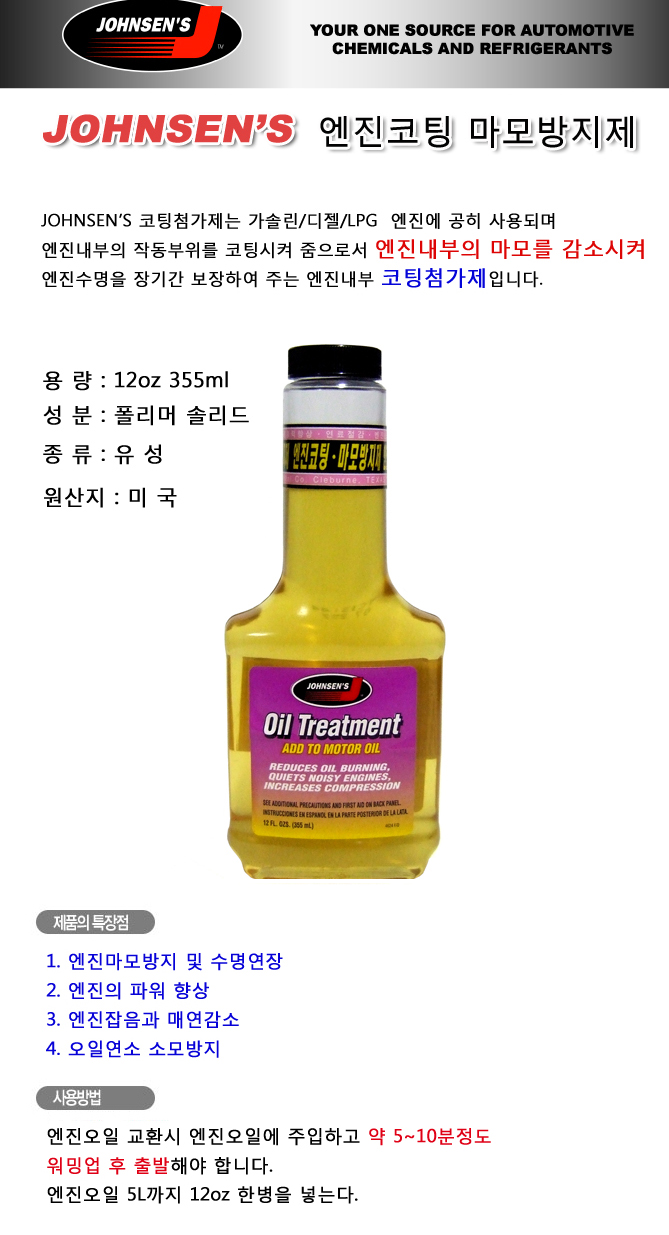 [존슨] 엔진코팅&첨가제(오일트리트먼트/엔진코팅 마모방지제) 355ml-1개SOLDOUT